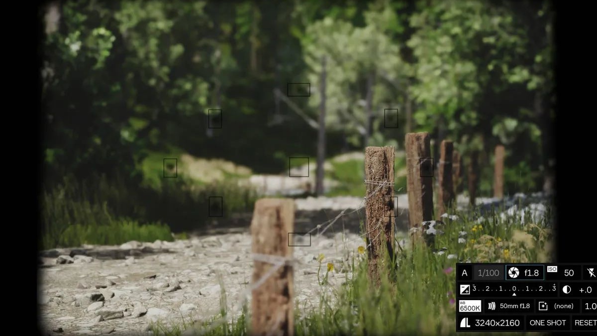 The in-game camera includes an abundance of settings that you'd expect from a real-world professional DSLR camera. The camera simulates settings such as Auto/Manual Focus, Flash, Exposure, Contrast, White Balance, Aperture, Burst Shot, and other effects for full creative control over your photography. The game further provides tools that allow for manipulation of the environmental conditions for your photos, such as manual adjustment of light angles, fog, snow, wind, and rain.
